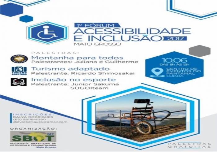 A Sociedade Brasileira de Ortopedia e Traumatologia de Mato Grosso (SBOT-MT) realiza no dia 10 de junho a primeira edição do "Fórum de Acessibilidade e Inclusão 2017", no Centro de Eventos do Pantanal, das 8h às 12h. O objetivo é promover ações com efeito educativo e motivacional, que retratem a acessibilidade e inclusão como atributos indispensáveis na sociedade, permitindo que todos possam desfrutar das mesmas oportunidades em turismo, esporte, lazer e cultura.